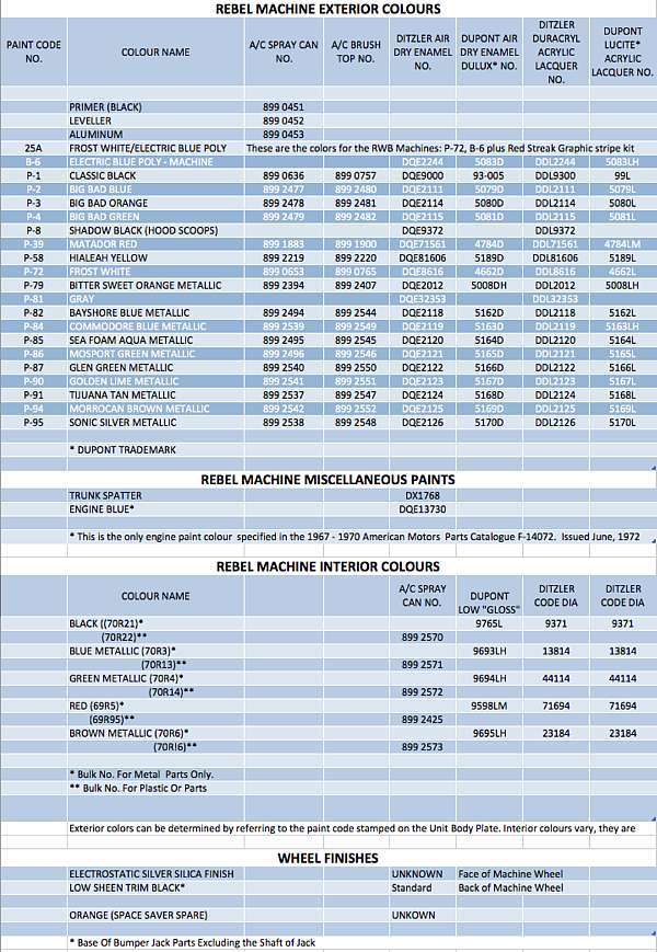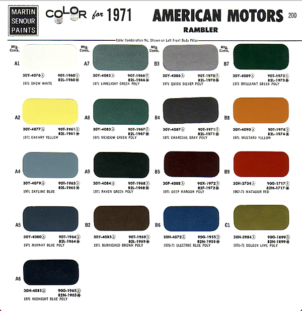 The 1970 AMC Exterior Colour Line UpAs of May 26, 1969 there were 14 colours offered. The Machine paint scheme was not among the colour offerings listed. So there were the 14 colours with the three 1969 Big Bad Colours - Green, Blue and Orange added later. That brings the total to 17. But B6 - Electric Blue - 1971 - was an exterior colour and is included in the Parts book as an exterior colour for the 1970 model year. That gets us to 18. The next exterior colour added was Shadow Black for the hoods and scoops of the solid colour Machines. That brings us to 19. The Phantom colour is Gray P-81 was listed in 1970 and 71 - bringing us to 20. After 1971 AMC changed all of the colours and their designations and went with an almost completely new palette.