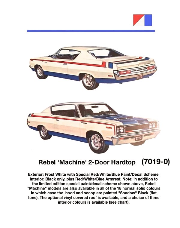 1970 AMC Paint FinishesWhen American Motors Corporation started accepting orders as early as October 4, 1969 for their 1970 supercar - THE MACHINE, it was only available in one exterior decor format: Red, White, Blue and Beige. All of the first one thousand Machines were to be painted that way. After January 1st any of sixteen colours could be ordered.