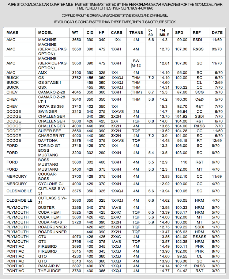 PURE STOCK MUSCLE CAR QUARTER MILE FASTEST TIMES AS TESTED BY THE PERFORMANCE CAR MAGAZINES FOR THE 1970 MODEL YEAR