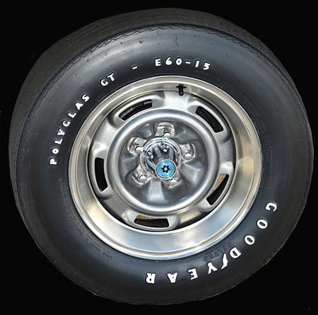 The 1970 Rebel Machine came with newly styled steel wheels made by Kelsey-Hayes specifically made for AMERICAN MOTORS CORPORATION. They were for the times both innovative and regressive due to their design. The wheels were introduced on THE MACHINE as standard equipment and were 15" X 7" with E60-15 Goodyear Polyglass tires with raised white lettering on the side walls fitted on them. The finish was a metal coating featuring a fine grit and a little metallic metal flake to add dimension to the finish. This finish has never been duplicated exactly by anyone. So wheels still sporting their original finish are rare. These wheels were also optional on 1970 AMXs and Javelins. In 1971, THE MACHINE was no longer a distinct model, it was an option on the new Matador. The option included the Rebel Machine intake, but no hood scoop. The exhaust manifolds had been updated to a free flow style that looked like and performed like a set of headers, so the special Machine exhaust manifold had been superseded. Nothing else was Machine specific. Again for 1971; the AMX model was gone, replaced by a new (2nd generation) Javelin body. AMX was an option and one of those options was the Machine wheel. The fact that more models than just the Machine meant that as years passed more Machine wheels survived than would have been the case if only the one model had worn them. Even so, there were differences between the original Machine wheels and the subsequent issues.