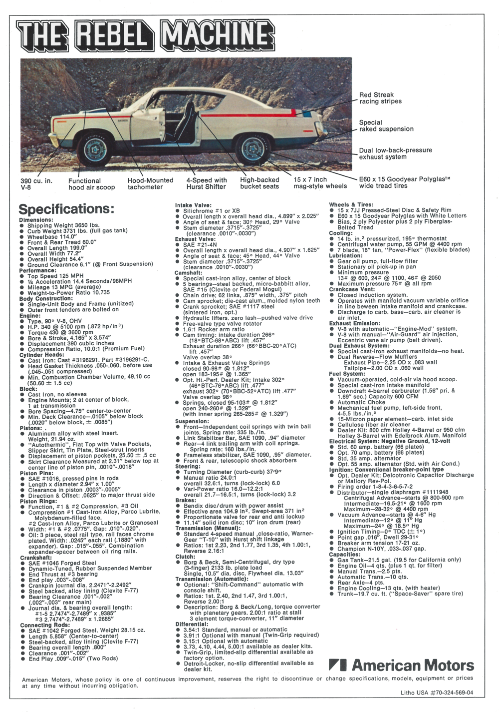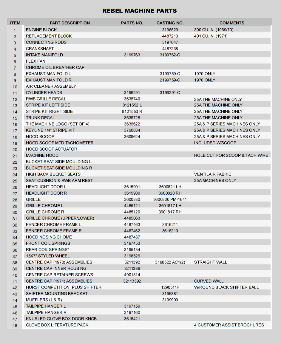 Group 19 V Code Service PackageIn the glove box of every brand new Rebel Machine sold was a booklet about the Rebel Machine describing its various features and adding another dimension of fun to the car. On the back page of the of the booklet was an entire page of specifications for the car. That page is reproduced below for reference. This little booklet may have been unique in all muscle-cardom. What made it unique was the optional dealer installed optional Service Package that included a performance camshaft, a 959 or 850 Holley, distributor, all the valve train components and Doug Thorley Headers for a fairly simple top end upgrade that would net out at 472 horsepower. All of that installed cost an extra $500 USD at the time. Click on the image below to download it as a printable PDF Factory WarrantyThe Service Package was known as the V Code dealer installed option. The only place it has ever been found in corporate print is in the middle of the back page of the Rebel Machine booklet. The valve train parts and cylinder head blueprinting could not be factory installed because there was no room to do the work. American Motors stated elsewhere in its literature that it would not warranty performance upgrades. In practice however, I have never heard of a denied warranty claim of any sort by AMC other than for abuse of the valve train. Valve jobs were simply not covered in any way shape or form on a performance model. AMC publicly stated that their dealers' service bays were extensions of the factory floor due to lack of real estate in the Kenosha factory. Service Package equipped Machines, AMXs and Javelins should have been accepted as Pure Stock the same as any other manufacturer's optioned muscle cars. The race tracks didn't buy it though in what can only be called a case of cutting your nose off to spite your face. AMC’s performance models were some of the prettiest cars that could have enhanced the glamour of race day. The Service Package was not the only thing that wasn’t factory installed. There were many dealer installed options on AMC cars including the mirrors. We’ll get to why this is important. V Code Optional Service PageRebel Machine Options for 1970*This list of options was provided by Mickey Ziomkowski when he started the Rebel Machine Registry in 1992. No one has ever found fault with the information posted here although in the intervening years, Mickey has forgotten where the information was pulled from originally.  | |||