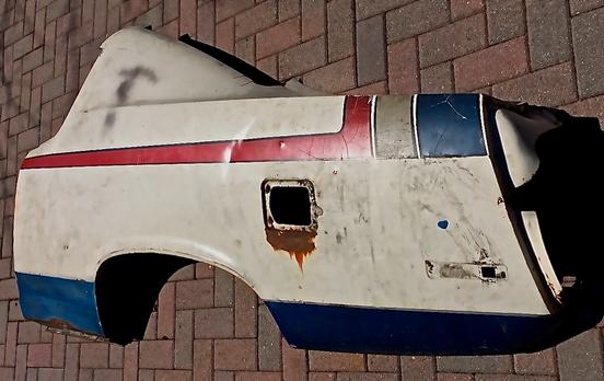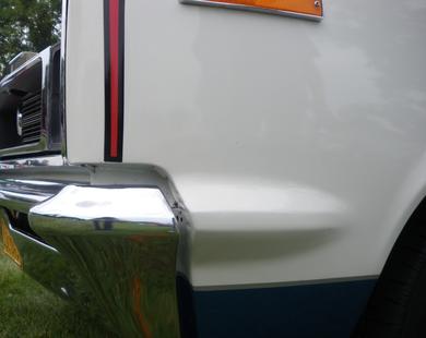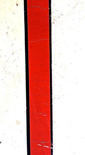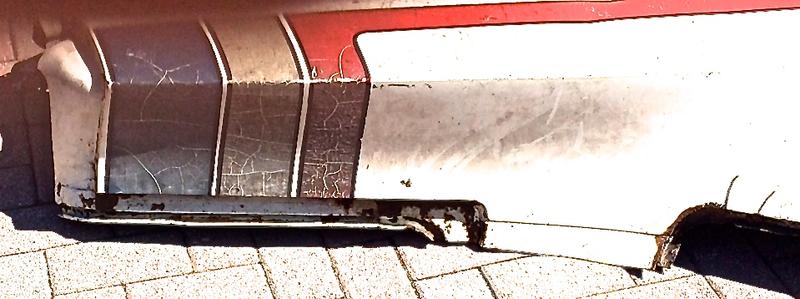 Tales from the Rear QuarterThere have been countless discussions about the stripes and the rear quarters. I thought I'd share some of the things with you that this rear quarter has told me. It's kind of beat up and the bottom of it is rusted off. You can't see that in the photo. It's been hit a couple of times but not hard. The stripes are interesting because they are from the first generation of stripes and factory installed when this unidentified Machine was first made. You can clearly see the centre stripe is far from the silvery white that appeared in the second generation of stripes over ten years later. But more interesting than that is the black outline. If you look closely, you can see that the black outline on the horizontal part of the red stripe is a different width on top - wider - than it is on the bottom, much thinner. In fact half the thickness. The width of the bottom black outline varies from over 3/8th of an inch to a quarter of an inch.