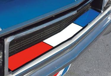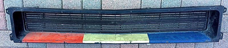 You can see from this image that the rear edge of the blue stripe parallels the seam of the rear quarter and sits back about 1/8 th of an inch. That is not the case as the stripe crosses the top of the rear fender and descends towards the trunk. The gap increases and varies according to how much of a gap there is between the stripe and the end of the quarter on the vertical side. On the left you can clearly see the variation in the width of the black key line. If I or anyone else were to produce stripes that were that out of true, there'd be complaints. So there's a limit to how original a modern part can be. Especially in this case because every set of stripes was different. Mine are too but not to this extent. The Original Grille StripeTo settle another controversy once and for all, below is a shot of an original first run grille stripe. One piece, not three. A very creamy beige in the centre - not white. In this shot note that the decal folds up the rear wall of the venturi opening by about 1/16" and folds down the front face. The chrome trim is installed with clips on top of that.