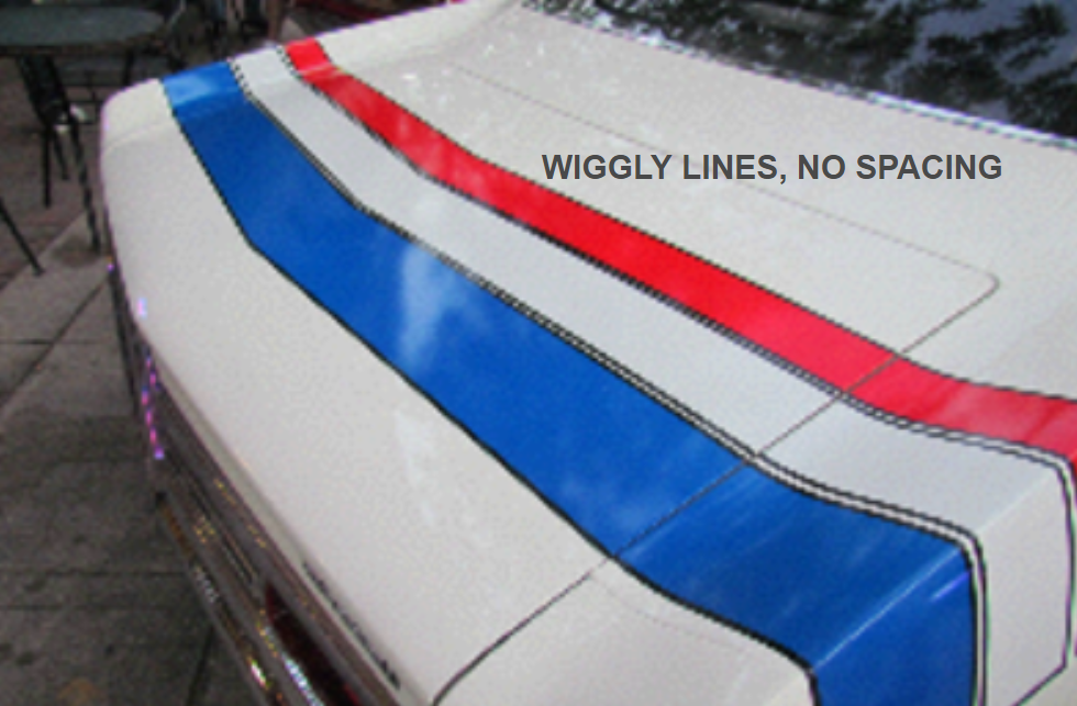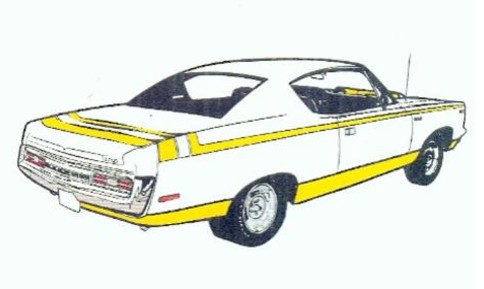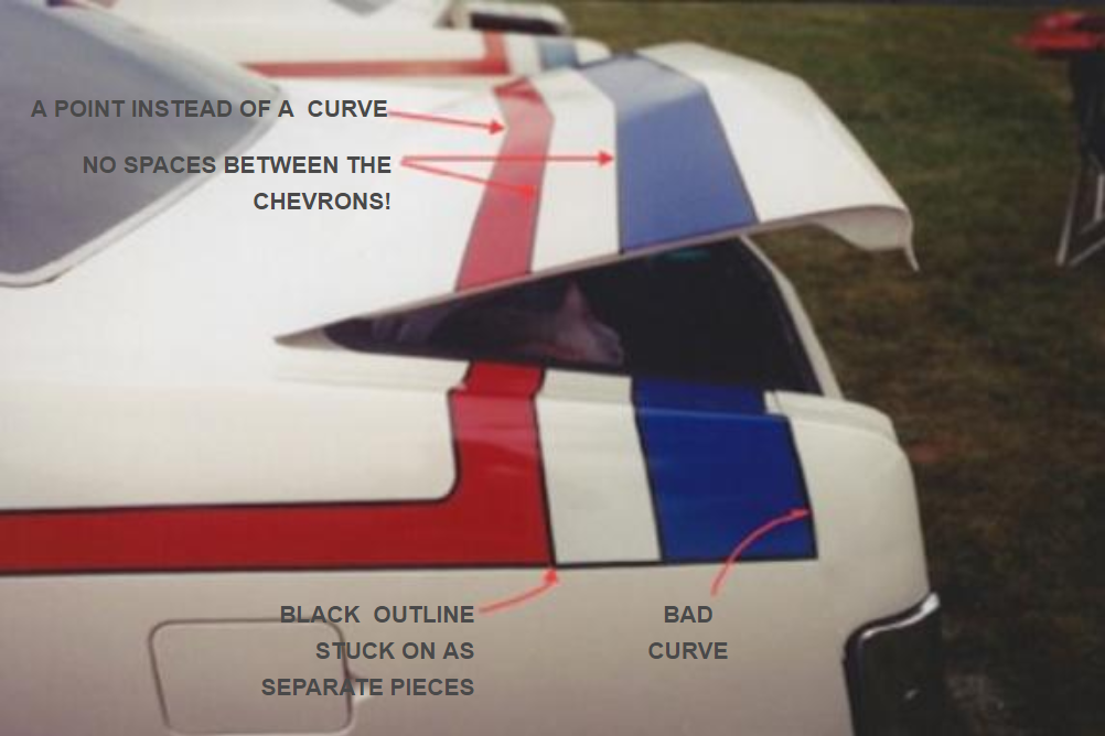It should be understood that since my stripe kits were based on the second run artwork, there are deviations from my first run stripe kits that even I could not anticipate..Since then I've acquired the original dyes that AMC and 3M used to make the original first run stripe kits that were very distinct from the second run produced in the late 80s. There is no more complicated nor more difficult production automotive graphics out there that I know of. All of the dimensions are critical and there is little margin for error. Predictably, after a few years of me successfully making the stripe kits, Phoenix Graphics suddenly decided it was worth their while to jump into the game. The rumour is that they paid a lot of money to get permission from Chrysler to produce the stripe kit. What they got for that money was permission and apparently that was all. No artwork, no colour specifications, no information and no help. Since no one at Phoenix Graphics had the slightest idea what Rebel Machine stripes are supposed to look like or even what the correct name of the stripe kit is when they started making the stripes, what they made were kits that were wildly incorrect. As of this date they still advertise their kits as being correct with an illustration of an incorrect kit. That's how much they care about getting it right for their customers. On the other hand from a marketing standpoint, how many kits are sold per year? There are only two to five cars in active assembly in a given year. There are only about three hundred Machines left and half of those are solid colour cars. Most of the Machines on the Registry are complete so to spend a lot of time and money fixing a product that could only lose money if you did doesn't make any kind of financial sense. There is a saying in retail sales:
